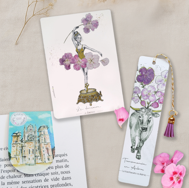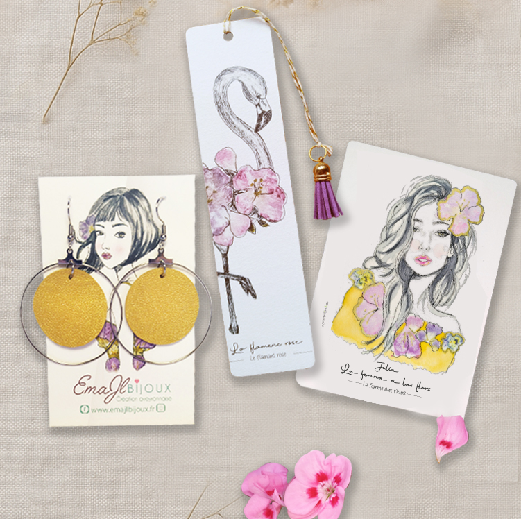 Cartes, marque-pages et illustrations entre poésie et artisanat : tatakizomé, aquarelle et dessin se rencontrent.