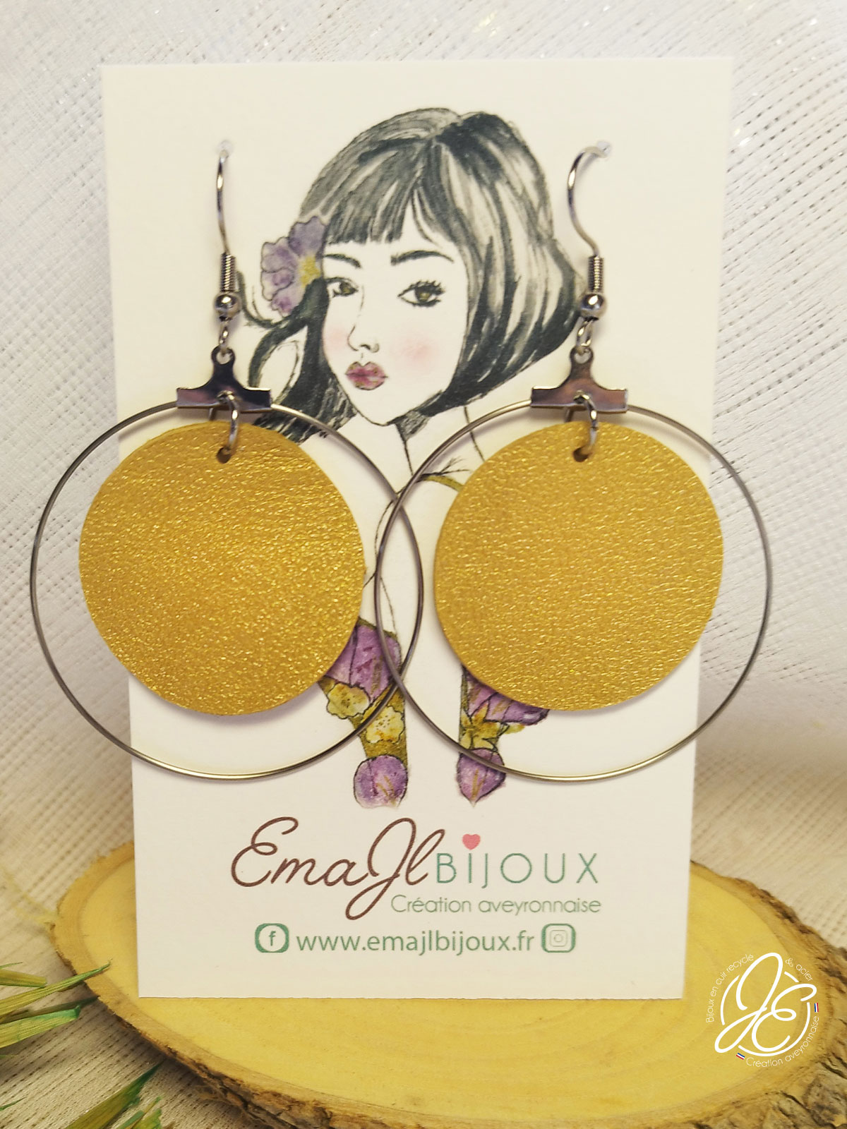 Les boucles EmaJl Bijoux sont réalisées à la main, en cuir recyclé et en acier inoxydable doré, un métal résistant et durable.