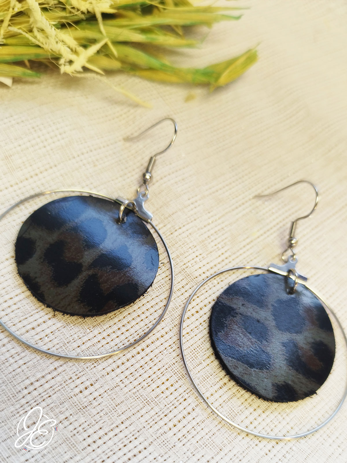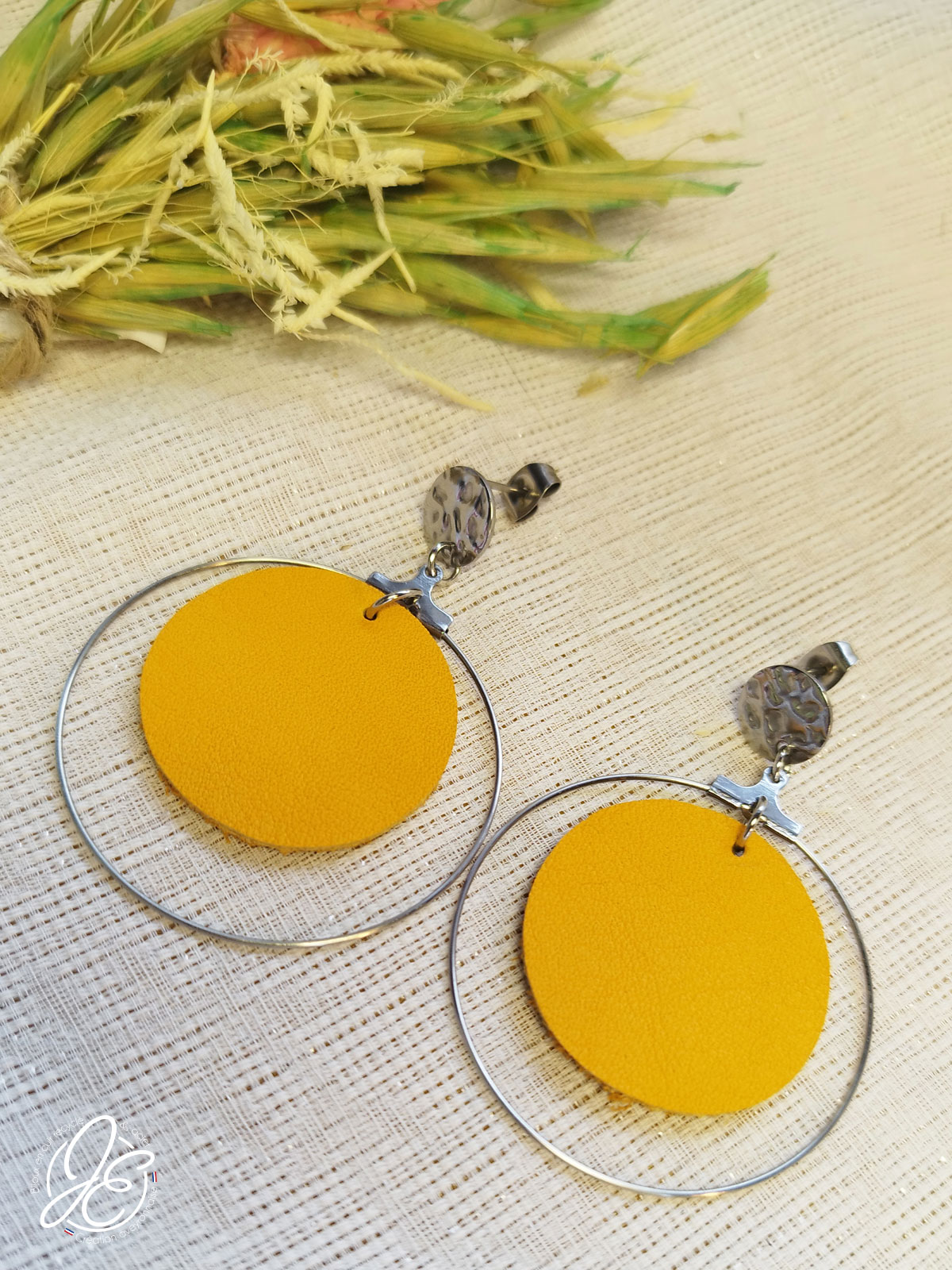Un cercle argenté délicat entoure un rond de cuir recyclé, formant un équilibre parfait entre matière brute et éclat métallique.